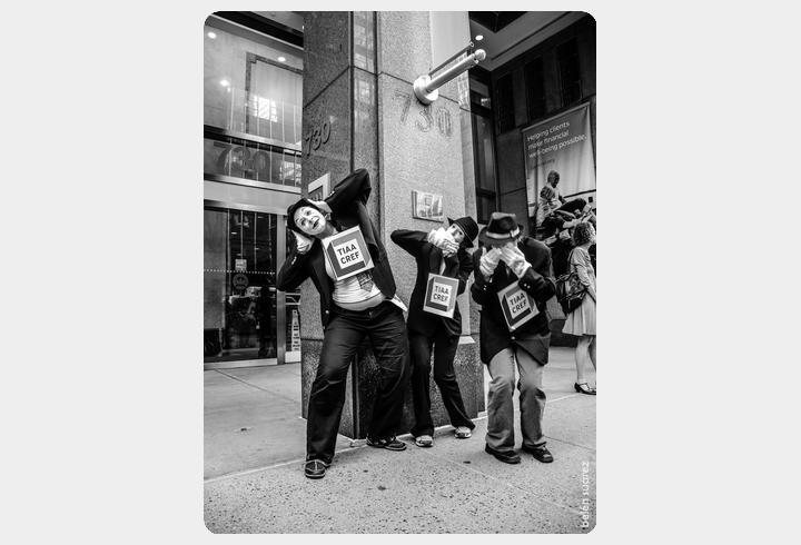 Photos from our TIAA-CREF National Day of Action in NYC, July 17, 2013 Prev Play Pause Next Post date: July 17, 2013Associated Event: Join the Anti-Apartheid Mime Troupe to demand TIAA-CREF divest from the Israeli occupation of Palestine!Our Work Sections: TIAA-CREF DivestContent Type: Photo GalleryShortlink: https://j.mp/3jtFPtU